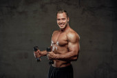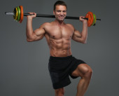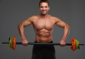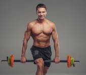 Średnim wieku muskularny mężczyzna trzymając sztangę.
