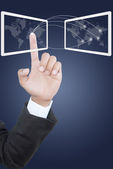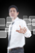 biznesmen naciskając przycisk sieć społecznych.