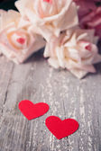 Pień fotografia czerwony drewniany serca na drewnianym tle
