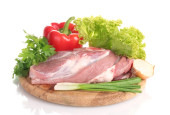 Surowe mięso i warzywa na deska na białym tle na Zielone Świątki?