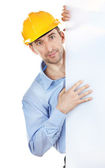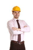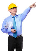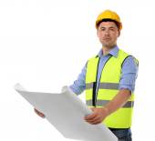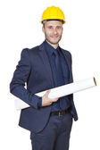 architekt młodego człowieka z hełmem i projekty na białym tle
