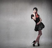 młoda brunetka stanowią w modne sukienki w pobliżu szkło dekoracyjne.