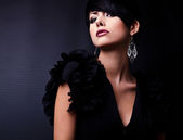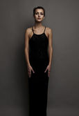Piękna kobieta na czarnej klasycznej pozycji sukienki w studio.