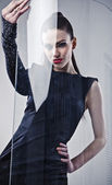 Piękna kobieta na czarnej klasycznej pozycji sukienki w studio.