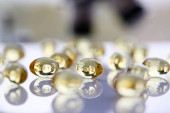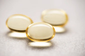 olej z wątroby dorsza, widok makro na białym tle tabletek (kapsułki)