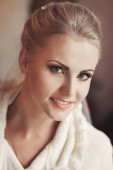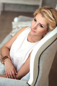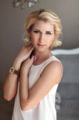 Portret atrakcyjny zmysłowy niebieskooka blondynka w białych bl