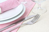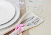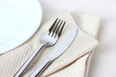 Nakrycie stołu widelcem, nożem, talerzami i serwetką
