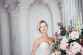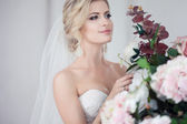 Charming beautiful young blonde girl with red lipstick on my lip