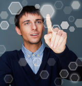 Biznesmen wciskający wirtualne przyciski