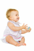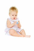 Infant Baby girl kid sitting and holdingin hands jar of child ma