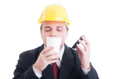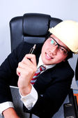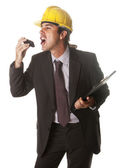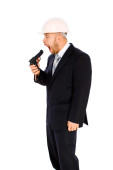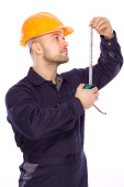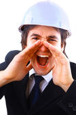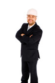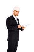 inżynier w kasku na białym tle