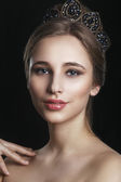 Portrait of young beautiful woman wearing golden party mask