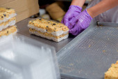 mężczyzna wyciąć ciasto ciasto Napoleona