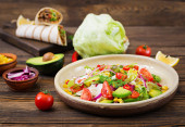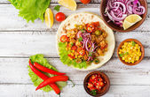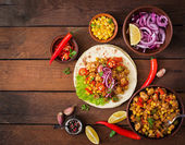 Meksykańskie tacos z mięsa, kukurydzy i oliwki na drewniane tła
