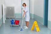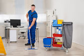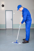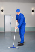 Mężczyzna robotnik z szczotka do czyszczenia korytarza