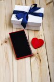 Zdjęcie "Inteligentny telefon, prezent i czerwone serce." może być wykorzystywane do celów osobistych i komercyjnych zgodnie z warunkami zakupionej licencji Royalty-free. Obraz jest dostępny do pobrania w jakości wysokiej rozdzielczości do 5760x3840.