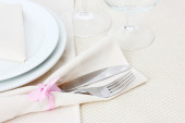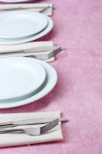 Nakrycie stołu widelcem, nożem, talerzami i serwetką