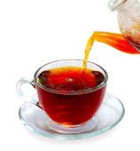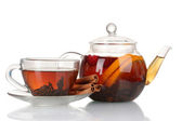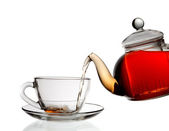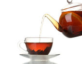 Szklany czajniczek wlanie czarnej herbaty do filiżanki izolowane na białym