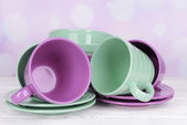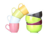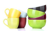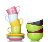jasne miski puste, kubki i talerze na białym tle