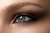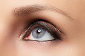 Zbliżenie: elegancja kobiece oko z klasyczny ciemny brązowy dymny makijaż. Makro pchnięciu kobiecej części twarzy. Uroda, kosmetyki i makijaż.