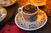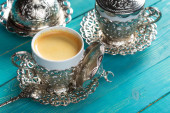 Coffee cup, walnuts and Turkish style cezve with tasty drink on blue tray