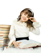 Ładna dziewczynka siedzi na stos książek na białym tle