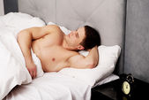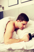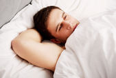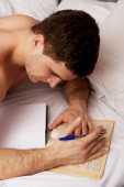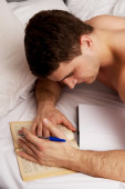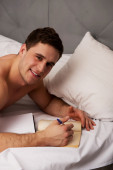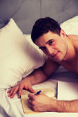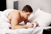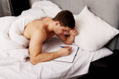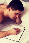 Zdjęcie "Rozważny człowiek z dopiskiem w jego łóżku." może być wykorzystywane do celów osobistych i komercyjnych zgodnie z warunkami zakupionej licencji Royalty-free. Obraz jest dostępny do pobrania w jakości wysokiej rozdzielczości do 5760x3840.