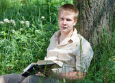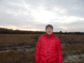 młody człowiek w pobliżu sosnowym wzgórzu na tle niebieski niebo i pole wiosną z zeszłorocznej trawy