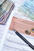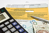 formularz podatkowy z kalkulatora, pieniądze i pióra