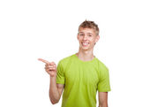 młody człowiek szczęśliwy uśmiechający się pokazuje coś