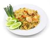 Smażony ryż z krewetkami i warzywami na białe płytki i białe tło