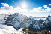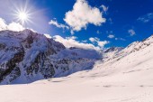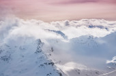 Piękny zimowy krajobraz z ośnieżonych gór na zachodzie słońca