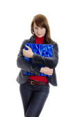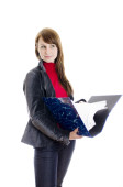 wesoły atrakcyjna kobieta długopisem. na białym tle.
