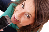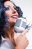 młoda kobieta przytrzymanie retro mikrofon. na białym tle.