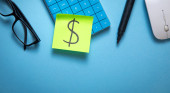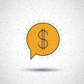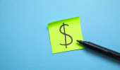 Znalezienie możliwości inwestycyjne prawa. Zielony Dolar pieniądze symbol znak na kij Uwaga na mowy Bańka i niebieskie tło.