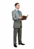 Człowiek w garniturze wygląda bardzo wstrząśnięty z notatnika