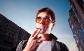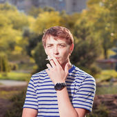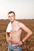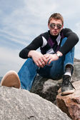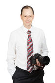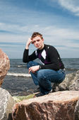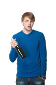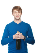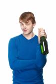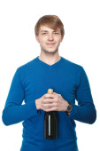 Młody człowiek z butelką szampana w niebieski sweter. Na białym tle