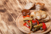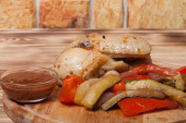 Kurczak z warzywami serwowane na okrągły deska do krojenia na spalony