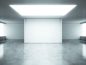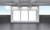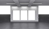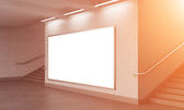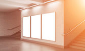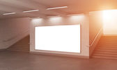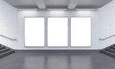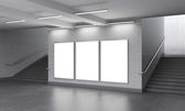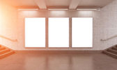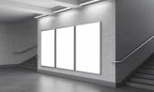 Three vertical billboards in the underground, stairs up to the left.