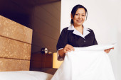 azjatycki pokojówka praca w pokoju hotelowym i uśmiechając się