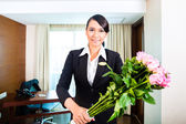 azjatycki pokojówka praca w pokoju hotelowym i uśmiechając się