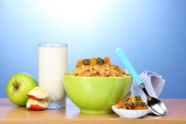 smaczne płatki kukurydziane w zielonej miski, jabłko i szklankę mleka na drewnianym stole na zielonym tle