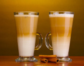 Pachnące? Unduli latte kubki szklane i cynamon na drewnianym stole na brązowym tle