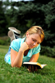 Młoda blondynka czyta książkę w parku