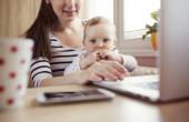 Młoda matka szczęśliwy z nią dziecko pracuje lub studiuje na laptopie