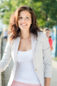 młody dorosły kobieta uśmiechający się na zewnątrz
