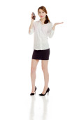 biznes kobieta, młoda dziewczyna, o hamulec, trzymając kubek powrót na górę.