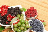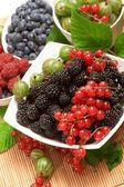 jagody w płytkach, na stole, wśród zielonych liści