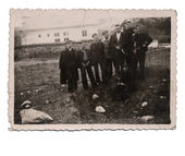 Archiwalne zdjęcie pokazuje ludzi na wycieczkę. Ludzie siedzą na przydrożny krzyż.