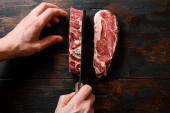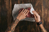 topview ręce trzymać papier biały trzy surowe steki
